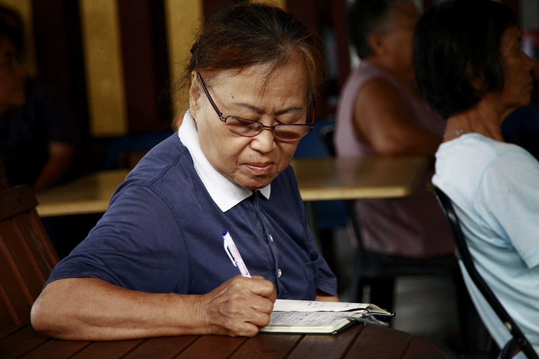 “我当作是在学习,能做就做。”她笑着说。遇到不会写的字,就翻报纸寻找相同的字形,对照着一笔一画抄写。有一次,她怎么也想不起“祖”字怎么写,报纸上也找不到,心里一直挂念。没想到睡梦中仿佛有人提醒她:“去看祖先的牌位就有了。”她一早醒来,立刻去看,果然找到了那个字。“做好事,冥冥中真的都有助力。”她开怀大笑。