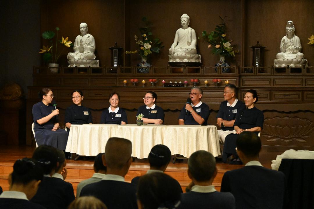 六位资深志工分享当年户外浴佛承担历程与初心。左起为司仪郭思慧,分享人林慧云、李桂英、曾思莱、侯东明、朱国财及魏碧华。【摄影:饶瑞泙】