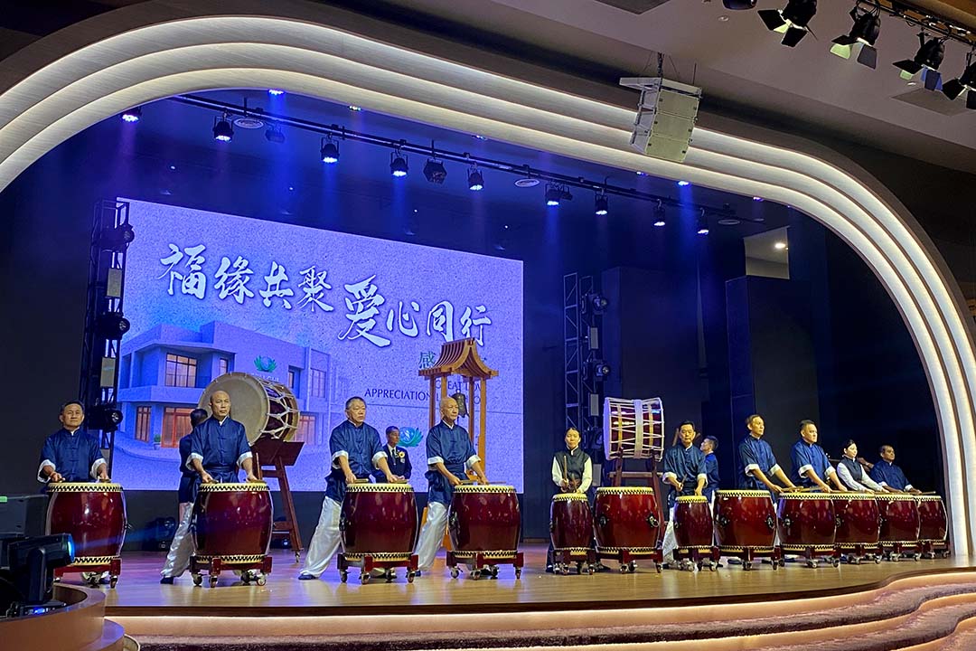 素宴节目最感人的时刻,是擂鼓鸣锣仪式。志工邀请赞助慈济乌鲁地南新会所建设基金的热心人士上台打鼓敲锣。锣鼓喧天的声响,萦绕整个会场,瞬间将现场氛围推向最高点。