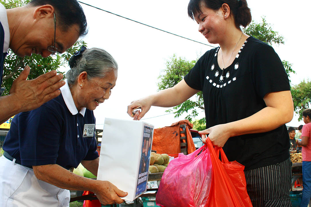 就像早年慈济人经常捧着爱心箱,走上街头劝募善心,邱金娘总是走在第一个,向众人弯腰鞠躬,面对不同族群时,她更是瞬间“色盲”,从不设限。当部分志工面对友族顾虑不前,邱金娘便用几句简单的马来语勇敢前行。一趟回来,就卖出了二十多本义卖券,其中不少还是友族购买。