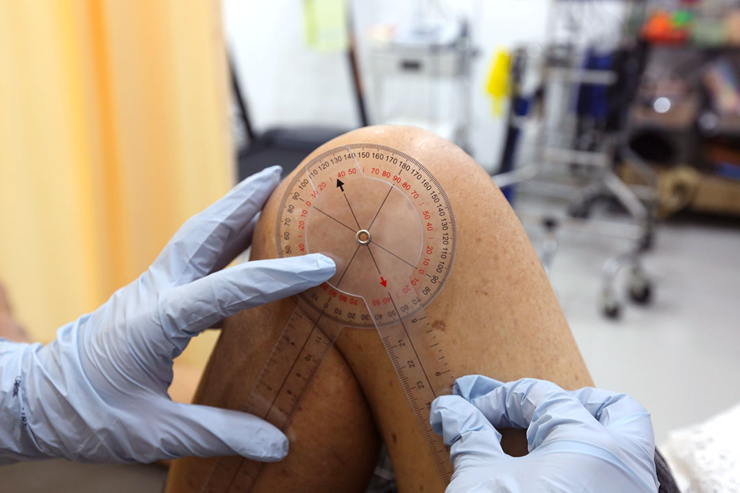 复健初期,物理治疗师细心观察伤口恢复情况,发现王玉梅的膝盖出现红肿及热痛,随即请门诊中心护士协助检查伤口,并说明药物使用与护理方式。进一步询问后才发现,她回家后仍静不下来,急着做家务、整理花园,让尚在修复的伤口承受过多负荷。于是,医护人员彼此配合,耐心向她说明伤口照护的重点,协助她调整生活步调;物理治疗师也从更轻柔的按摩与伸展开始,循序引导复健进程,同时叮咛她在家避免剧烈劳作,按部就班运动,最后再进行冰敷,帮助消肿与修复。