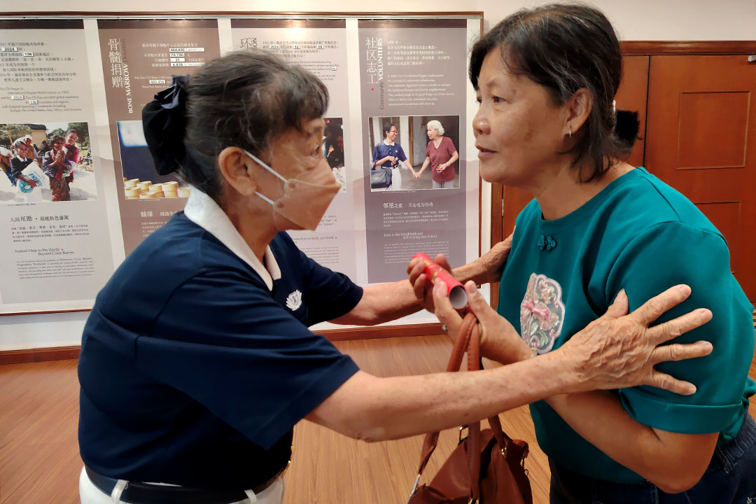 人不在现场,却在慈济环保站和其他活动中付出的两位志工阿嬷黄玉凤与吴桂花,得知胡爱佳特地回到慈济探望,两人都非常欢喜。