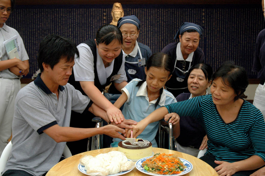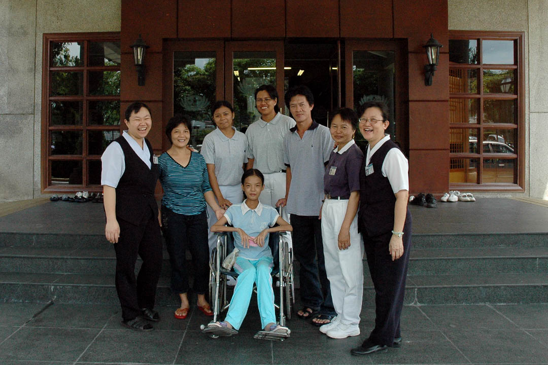 打从那天起,志工自行排班,轮番为一家三口送两餐、关怀他们的起居生活,还带胡爱佳去黄月吉医师(虑芸)牙科诊所做补牙、洗牙的免费治疗,为手术前做好安全的准备。当时,病床边总围绕着一群与她非亲非故的“亲人”,当中走得最勤的该属志工吴桂花(慈俞)、黄玉凤(慈旭)、黄志清(济清)等人,常常一放工就往医院跑。吴桂花和黄玉凤天天送便当、点心,嘘寒问暖,让胡爱佳直呼她们:“阿嬷”,也会跟爸爸妈妈说:“这两个阿嬷比我们家里的阿嬷还要好。”