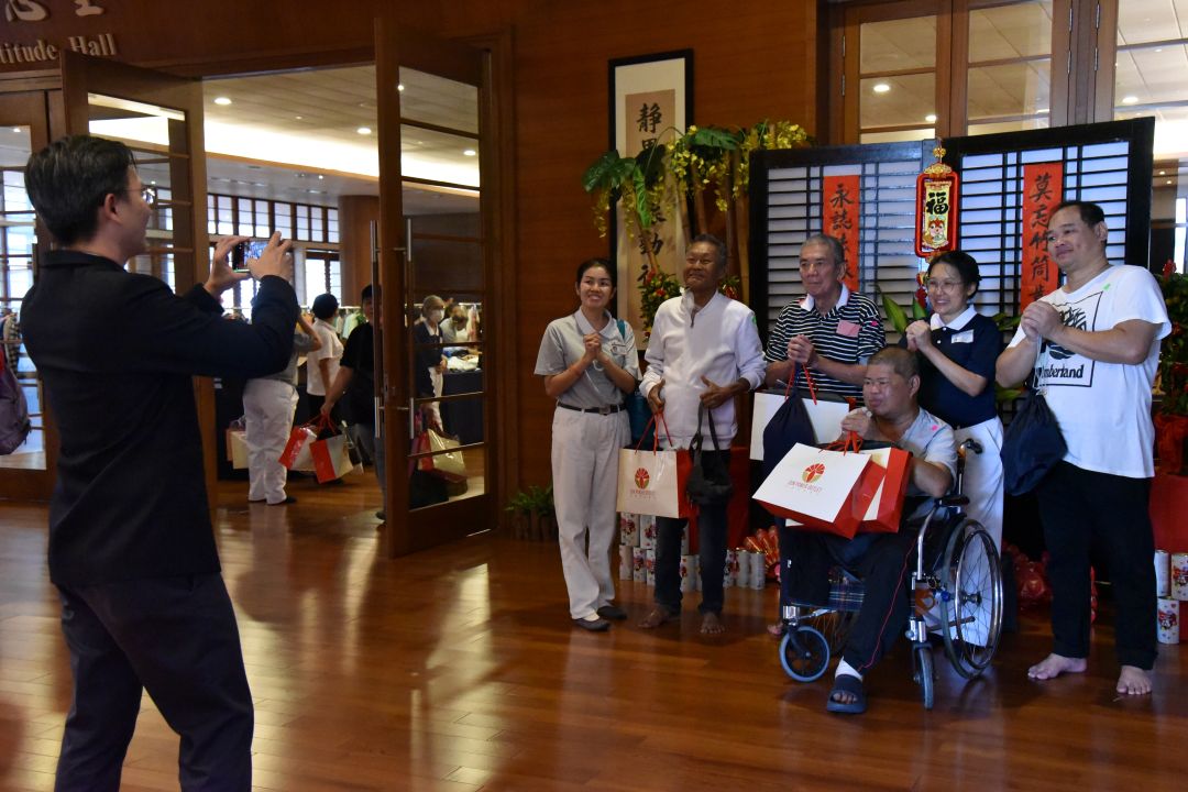 在欢喜声渐渐沉淀后,全场回归宁静,众人合十祈祷,为新的一年许下心愿。活动中,每一位照顾户也都领到一份有缘卡,内有静思语,它宛如新春的祝福与叮咛,期盼能在他们心中种下一颗善念的种子。