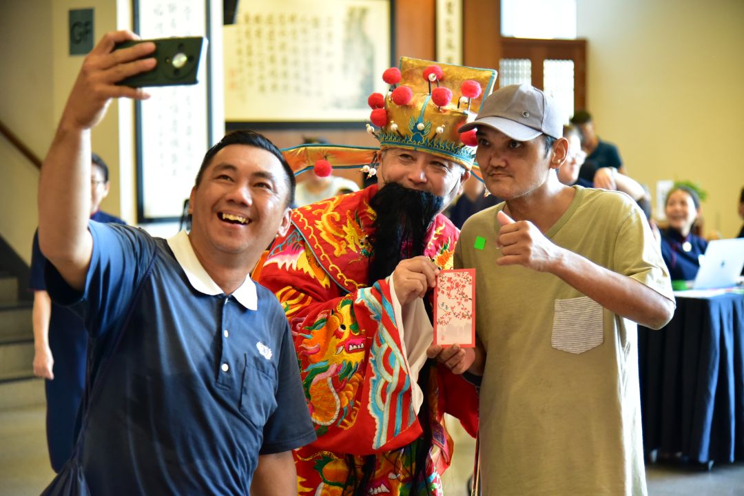 透过财神的扮演,志工将善念化为祝福,在会场中一一传递。【摄影:李莉芬】