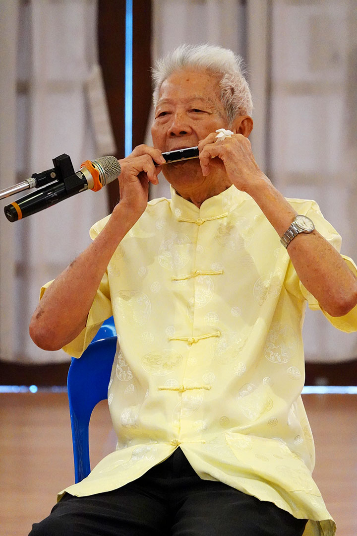“我会吹口琴、笛子、唱歌,也打太极,这些都是年轻时跟朋友一起慢慢学的。”早年朋友常相约喝茶聊天,他也常在特殊节日作即兴表演。自从老伴离世后,他多半只在家里吹口琴给孙儿听;这次在女儿安排下再度施展才艺于人前,让他重拾往日光彩。