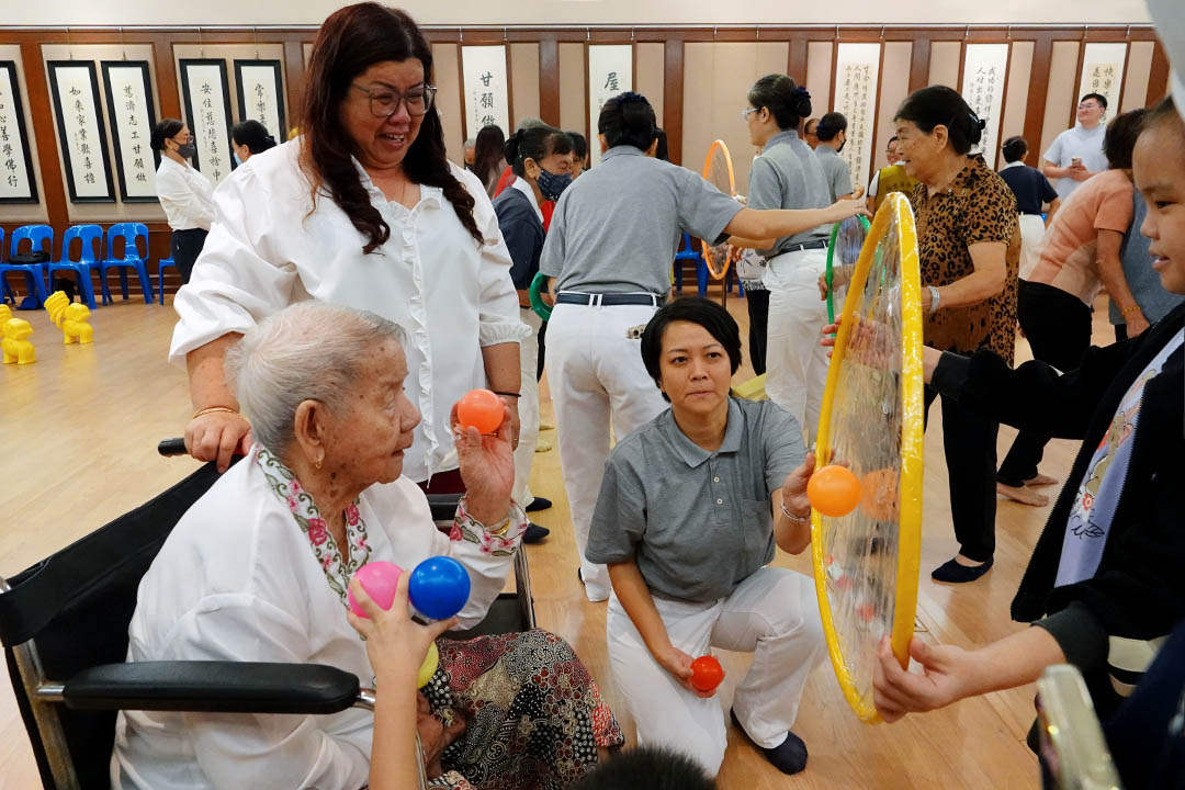 2025年11月8日长者学堂圆缘,点燃热情、重拾玩乐本能的黄玉香,兴冲冲说自己仿佛回到了幼儿园,从“大象鼻子套圈圈”开始,再有“呼啦圈里粘小球”、“脸贴脸传球”和“汤匙传乒乓球”等游戏;长者们在一轮又一轮的闯关中动手、动脚和动脑,现场热闹沸腾。简单的游戏,唤醒了童心与活力,大家“乐而忘龄、喜而忘忧”。