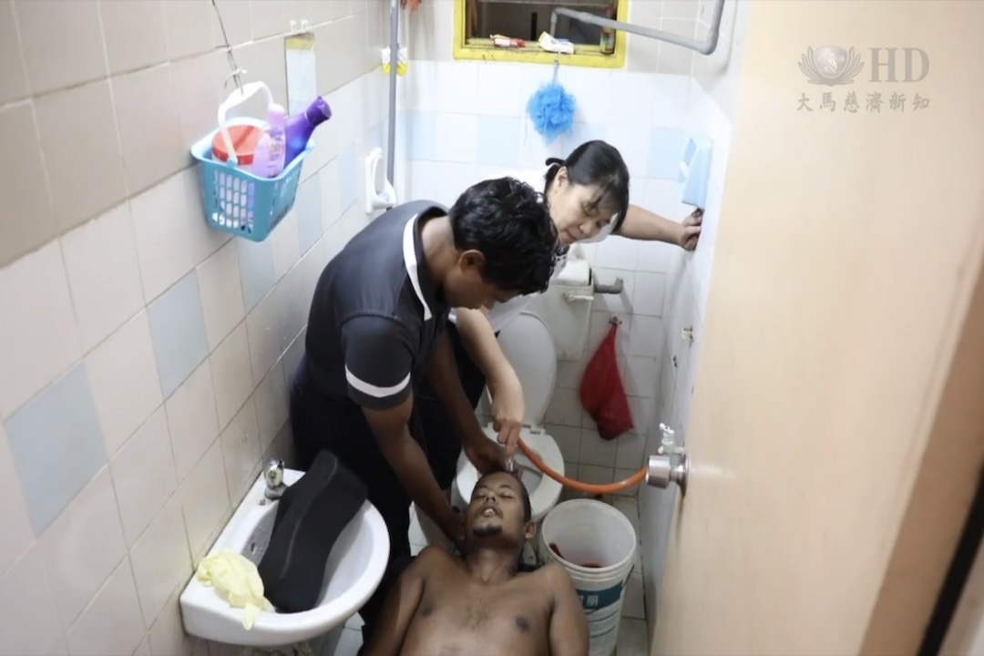 志工初见他时,他已七个月未曾洗澡。长期卧床、无法自理,连基本清洁都难以做到。志工不忍,为他洗去积垢,也替他拾回一分尊严。【摄影:大爱新闻截图】