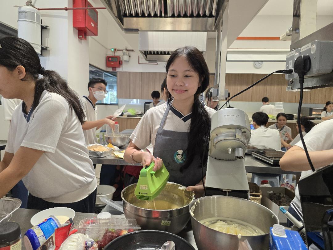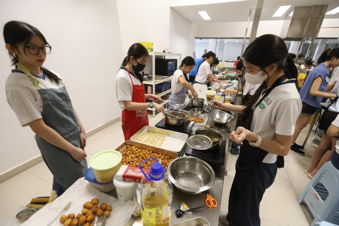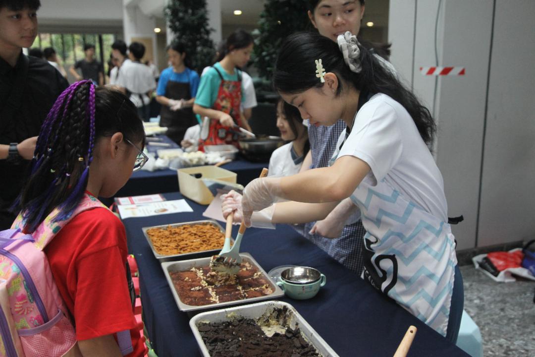 由于校方提倡环保,鼓励大家自备环保餐具,把垃圾用量减到最低。许多家长以实际行动支持,为地球出一份力。没带环保餐具的家长也无需担心,现场即可购买并马上使用。 在烹饪教室,一组学生正分工合作准备料理。狭小的烹饪室里挤满忙碌的身影,大家各司其职有人负责煎炸,有人制作无油烟轻食和饮品,更有人负责洗切,大家都有条不紊。 因为有共同目标,每一位参与学生都能合作无间;围上围裙、拿起厨具,学生都变身“小厨神”,尽情展现厨艺。 第一次参加义卖会的陈悦,与九位同学售卖四种口味的提拉米苏,其中一人还亲手制作可爱小玩偶助阵。“我们经验不足,有些材料准备不够,幸好家长马上送来。虽然很忙、很累,但能和朋友一起参与,眞的很开心!”