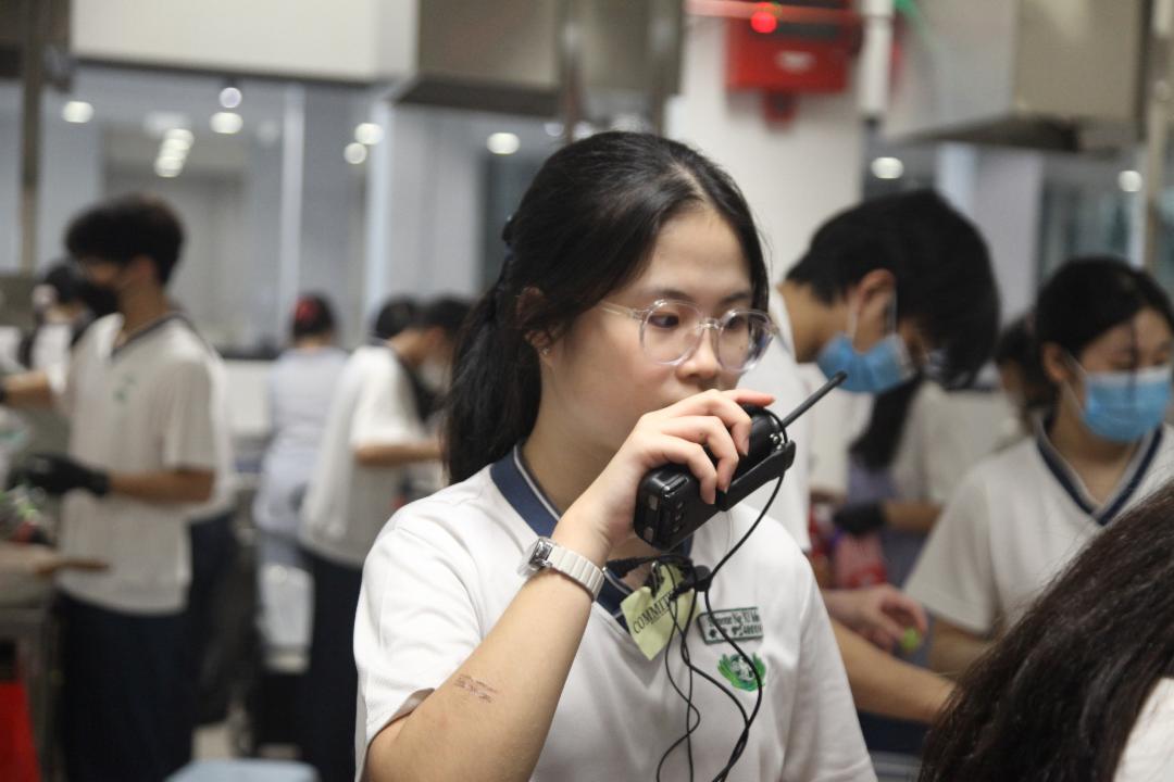 手持对讲机、穿梭在烹饪室内的黄希梦,负责食物补给和协调。“哪一摊需要送货、哪一摊滞销需要暂停……过程让我深刻体会沟通的重要。”义卖会前一个月,每一组学生都需提交活动建议书,阐明产品项目。筹委会根据建议与往年数据给予指导,确保不重复、不滞销。 希梦佩服每一位参与的学生。洗、切、煮,一刻不停;负责售卖的同学也跑上跑下。虽然大家很忙,但现场气氛却很愉悦。这就是付出的意义。” 义卖会进入尾声,留下协助清理,恢复烹饪室原貌。经过一整天的忙碌早已疲惫不堪,但脸上仍带着满足的笑意,因为这一天将成为他们一生的珍贵的记忆。