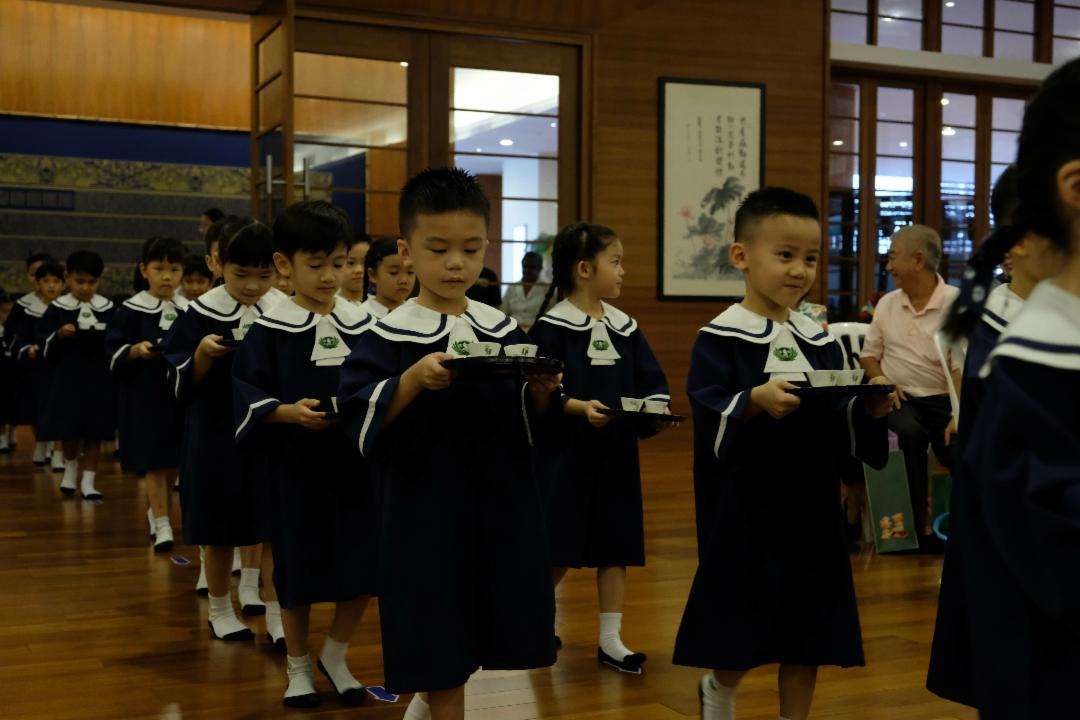 演出前,五十八位毕业生在老师引导下,手捧小托盘,恭敬地为父母奉上一杯茶。家长喝下孩子奉上的感恩茶,心中的激动尚未平复,一幕幕孩子在幼儿园三年成长的画面在荧幕上播放;孩子们从懵懂到自立、从害羞到勇敢、从只会接受到懂得付出爱,点点滴滴成长的过程让家长们感到莫大的欣慰。