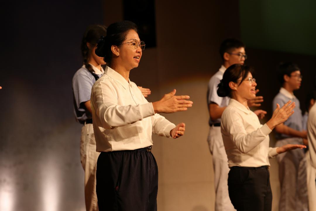 当〈报恩〉曲子的梵呗法音在感恩堂响起,舞台上四十六位大人与小孩,以流畅而虔诚的手语,演绎着父母恩情的浩瀚与难报。稳站台中央的李秀琴面带微笑,以熟练俐落的手语动作,将〈报恩〉演绎得丝丝入扣,赢得观众热烈掌声。
