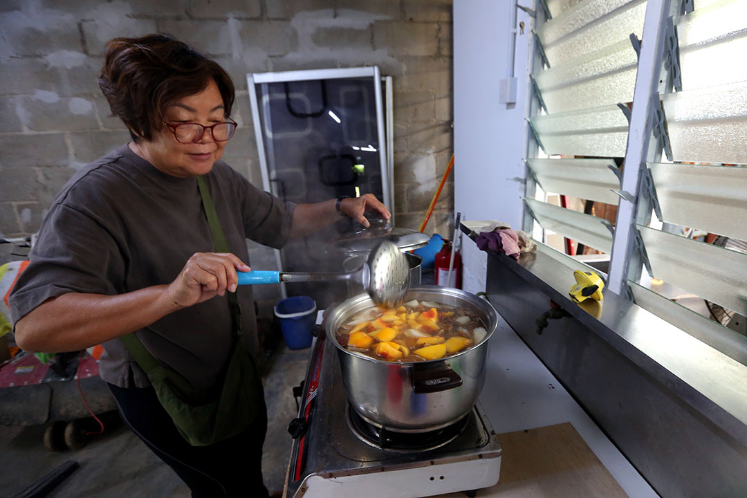 活动当天,她们最先抵达绿智农场,带来提早煮好的南瓜饭,再将之前备好的食材下锅烹煮。大火转成小火熬汤,白萝卜的香气渐渐扑鼻而来,拿着锅铲努力翻动的麦丽群,一句“担心食材数量不足”,副手郑雅娣马上动身到农场采摘。