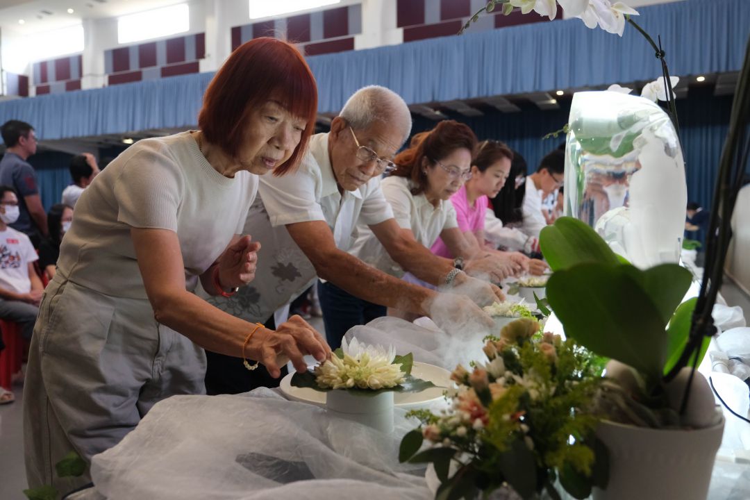 在浴佛典礼中观赏影片,看到当年自己家园发生水灾的画面,不堪回首,范秀珍眼眶泛泪。走到浴佛台前,手沾香汤,把玉簪花捧在手心里,范秀珍嗅到花香,感觉内心十分平静,她吸一口气说:“人心淨化,社会安定,集合大众的力量,我觉得做慈济很有意义,我很喜欢,也很感动自己有生之年,仍有机会付出一些微薄的力量,为大众服务。”