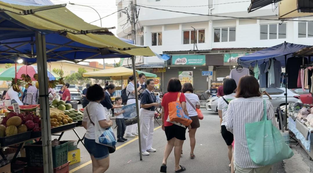 2026年3月21日,太子园菜市场人潮络绎不绝。摊贩的叫卖声、炒萝卜糕的锅铲声和顾客的喧哗声中,志工三人一组,手持“慈济六十周年庆、万人浴佛聚福缘”的海报、宣传单和慈济月刊,穿梭于人群中,或驻足角落,逢人就宣导浴佛信息。