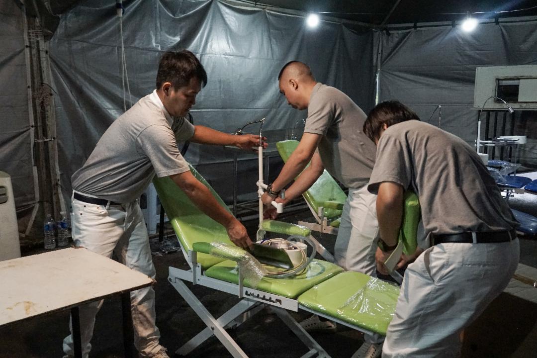 义诊当日凌晨,天空仍黑,地面仍湿,志工们早已陆续抵达现场。他们穿梭于帐篷间,搬运器材、安装牙医椅、甚至蹲身清理昨夜雨后积水,准备迎接义诊的开始。