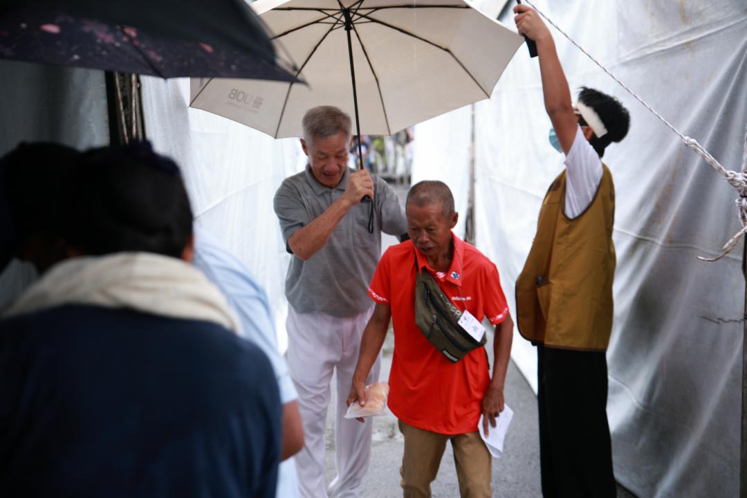 然而,天气并未如人意,晨间倾盆大雨再度来袭,水来不及排出,诊疗区棚内迅速积水。尽管如此,志工们并未慌乱,随即合力搬迁医疗设备,重新规划诊区,并积极疏通水道、清除积水。更令人动容的是,当病患陆续抵达时,志工们一一撑伞接应,让来者无需淋雨。