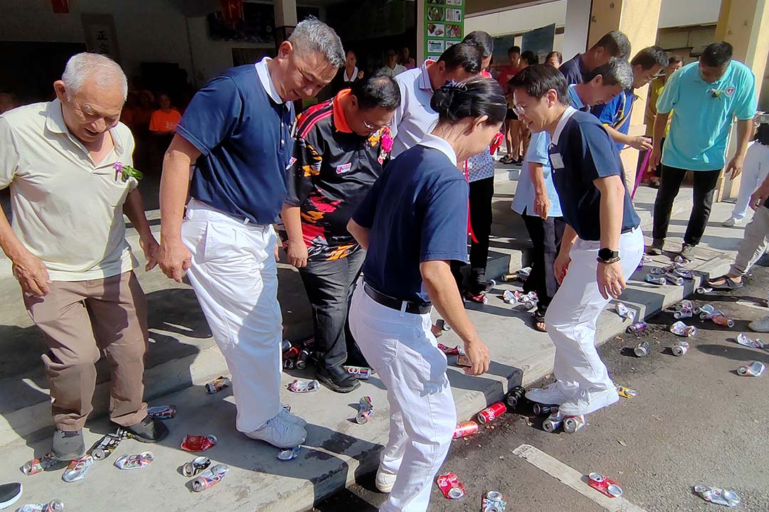 悬挂于天花板的大红彩球瞬间拉开,满满的铝罐倾泻而下,哗啦作响。大家欢喜地踩踏地上的罐子,声声作响,仿佛炮竹齐鸣,现场气氛瞬间沸腾。