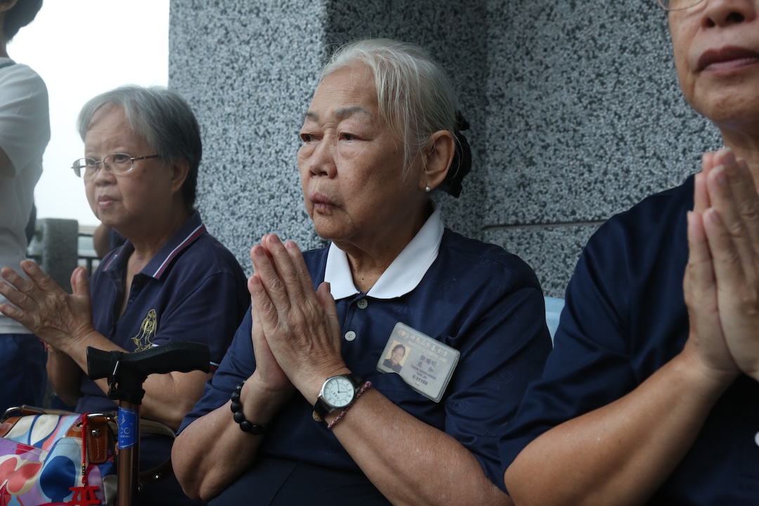 悠悠岁月流逝,邓顺明的一头青丝也变成白发苍苍,然而,她无怨无悔,纵使拿着助行器,也要一步步跟着上人走菩萨道。