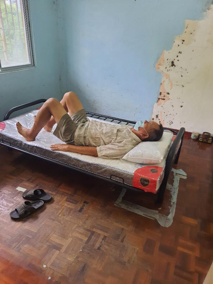 由于彭阿公睡觉的床具及床单已污垢处处,志工在房间里看到一张犹新的床铁架,彭阿公说要将它当单人床,于是,志工将之清洗,并检查是否完好无损后才搬去彭阿公房间。