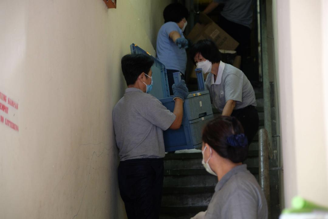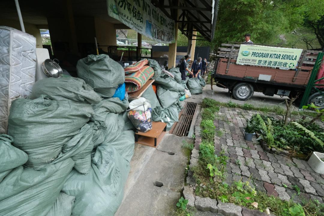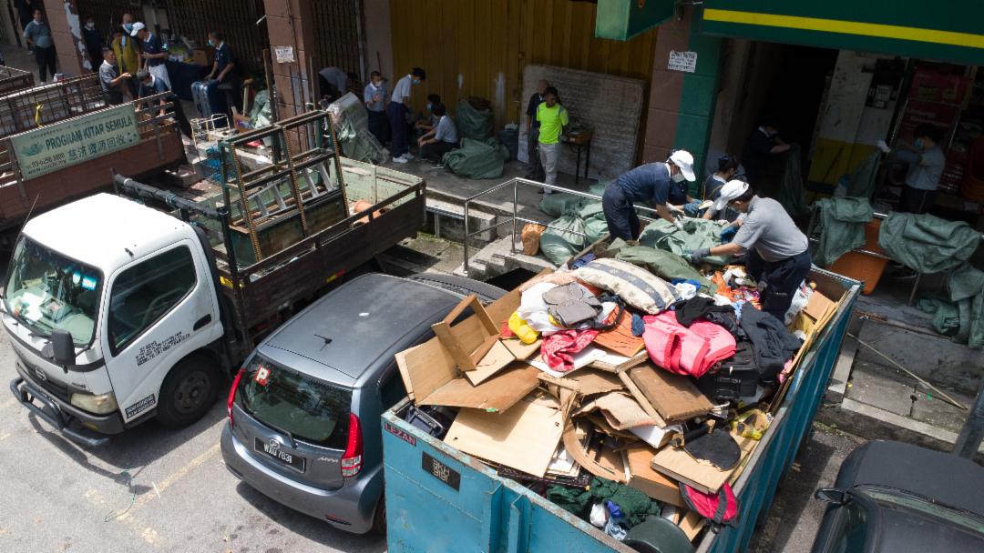 考量到杂物多,无法在现场细分,只能将所有东西装袋,一大袋一大袋拖下楼,丢上罗里载送到附近的环保站才做分类。此次打扫,除了申请市议会的大垃圾槽外,志工也出动两辆罗里运载物品到环保站。
