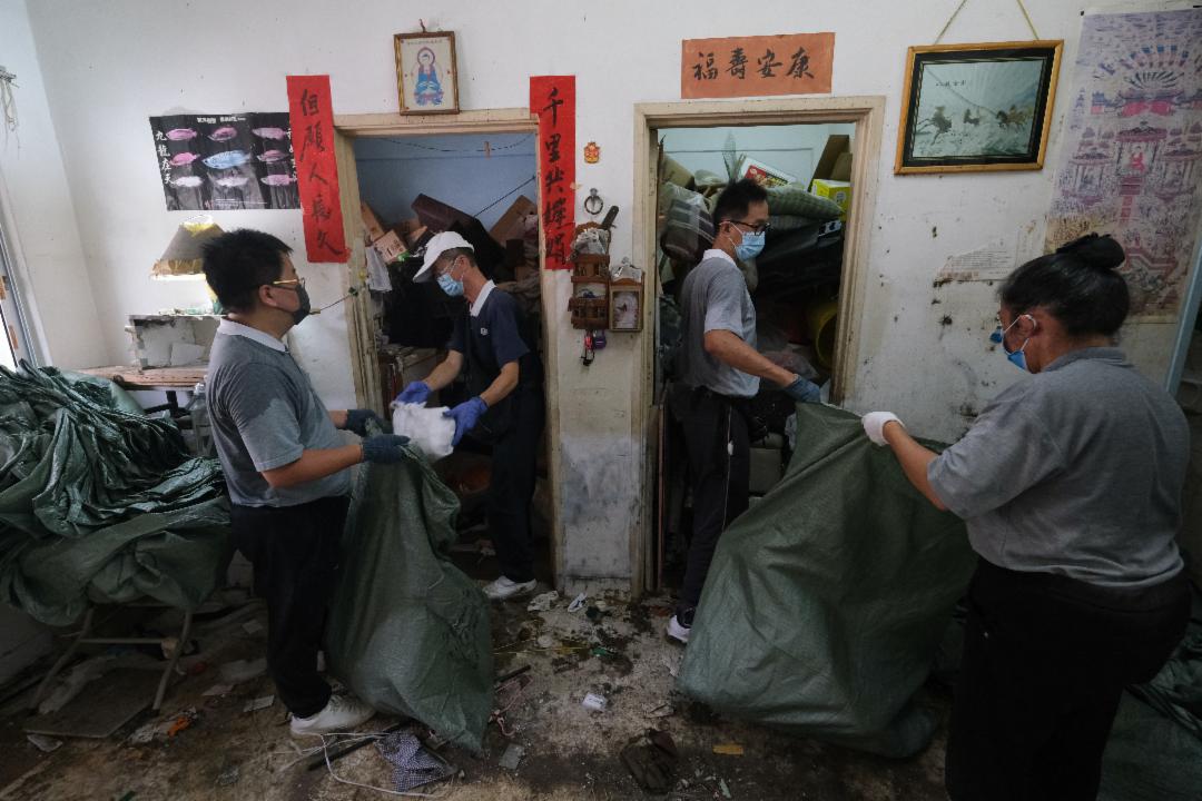 王华成(惟予)是负责打扫的协调之一,当下他叮嘱志工务必小心安全,同时,他根据规划,让志工先清理靠近门口、摇摇欲坠的架子上的杂物,然后将架子搬出来,才清理客厅和房间的杂物。