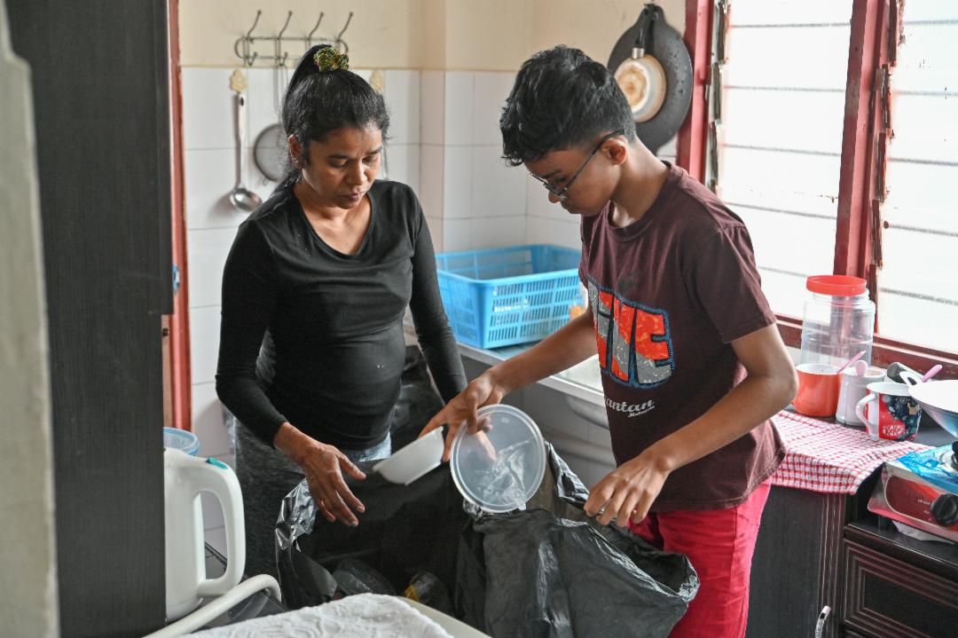 孩子把在环保站学习到的知识跟妈妈分享。重新获得工作后的妈妈拉洁斯瓦莉从工作的诊所在每天放工后,把清洗好、晾干的资源带回家;难得的是,同事见她如此努力回收,人人响应,把所有资源留给她带回家。每月第三个星期天是慈济环保日,他们再把一大袋资源从住家五楼带去环保点,与大家一起做分类。