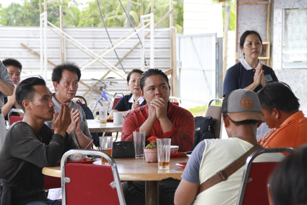 "麻坡静思堂工地的工友为印度尼西亚受灾的同胞虔诚祈祷。 【摄影:卢俊辉】"