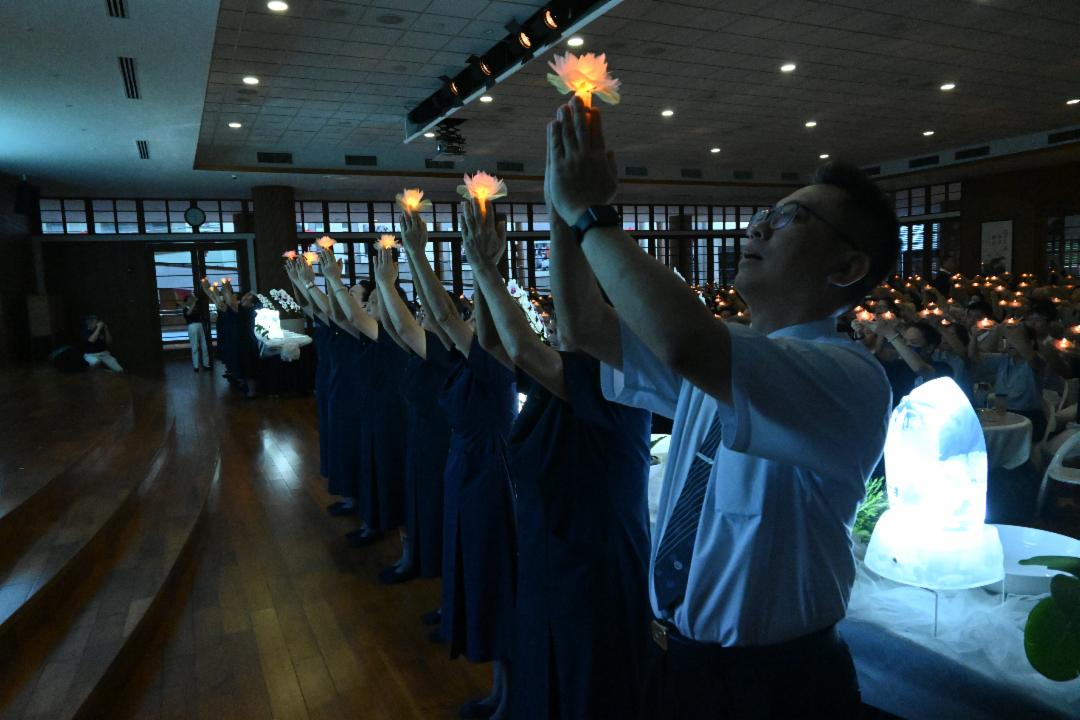 随着〈诚心祈三愿〉旋律流淌,志工手中点亮心灯。点点灯光如星海汇聚,映照着彼此真诚而坚定的眼神。大家齐声唱诵,有人闭目祈愿,有人眼眶微红。这份法喜,正准备化为实际行动。