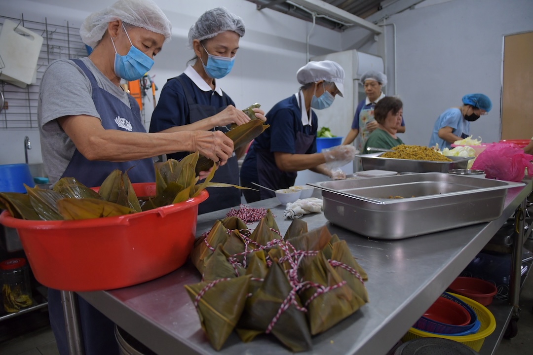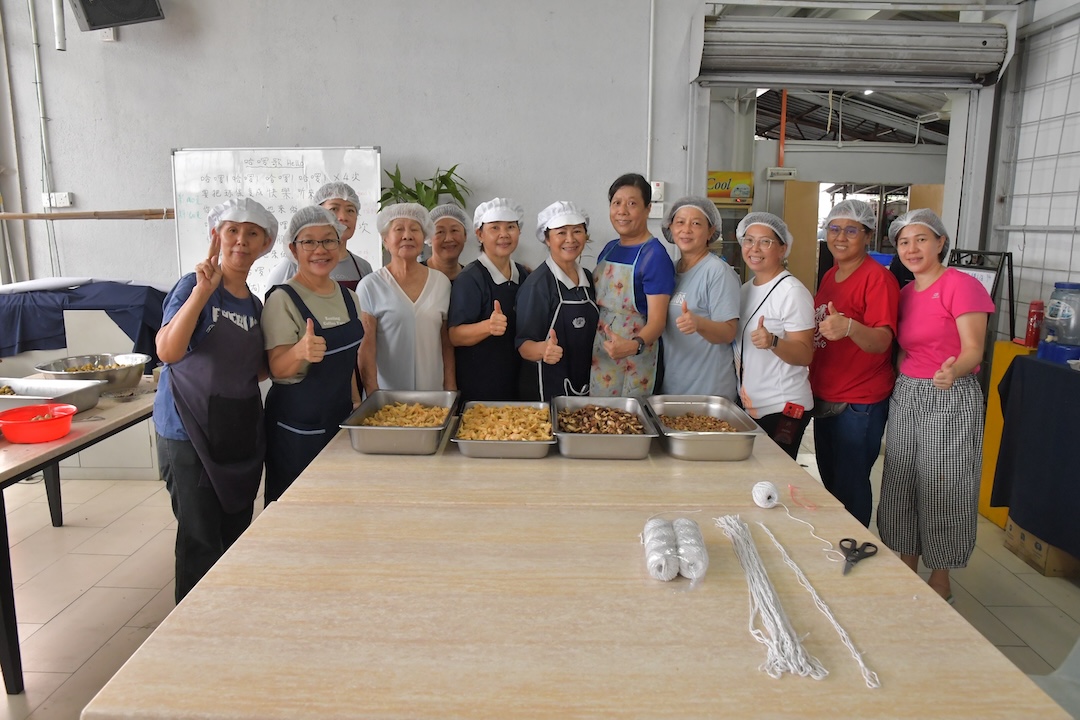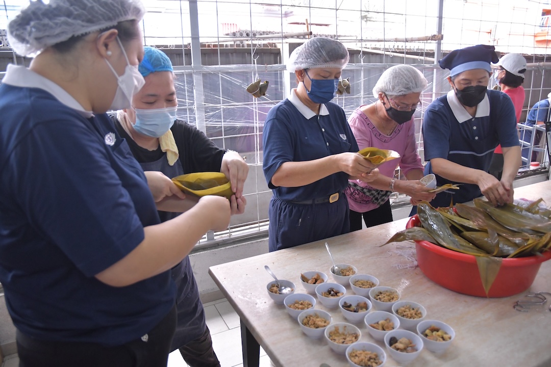 社区和气组长黄玉英(慈崧)在承接了社区志工的热情响应后,连忙找来社区里的香积组长讨论落实义卖的计划。为了让制作流程更加顺利,她们就先号召一小组的社区志工接连启动两次的小型制作,除了让大家能熟悉流程以外,也尽量完善每个步骤的安排,让素粽的制作能够更有效率。