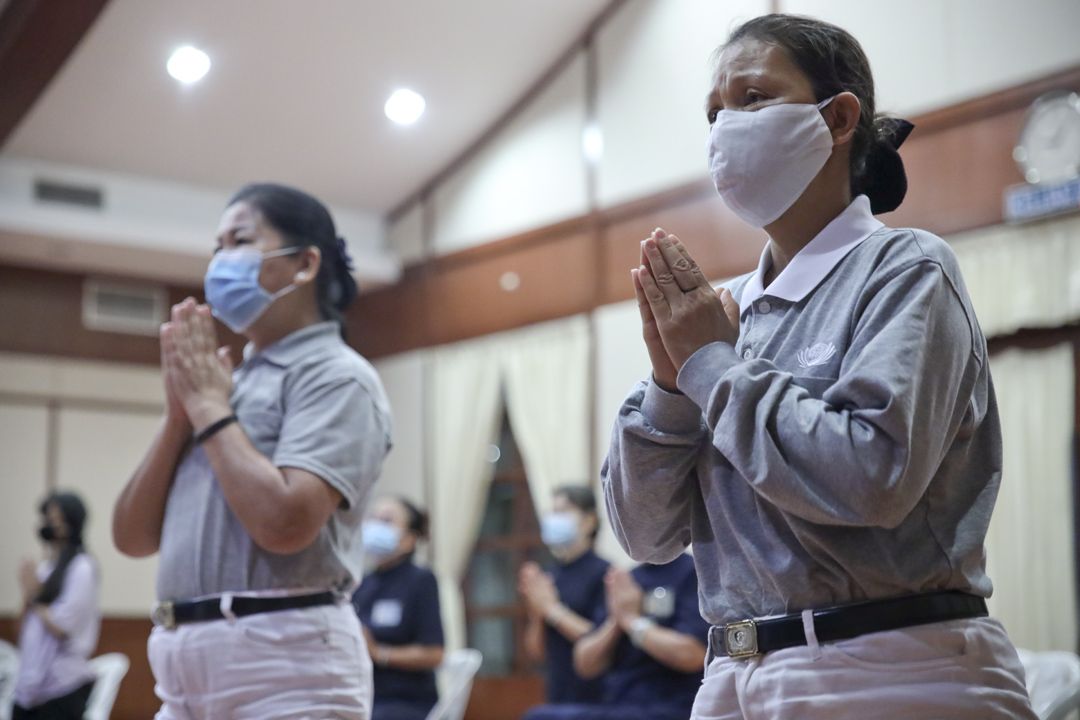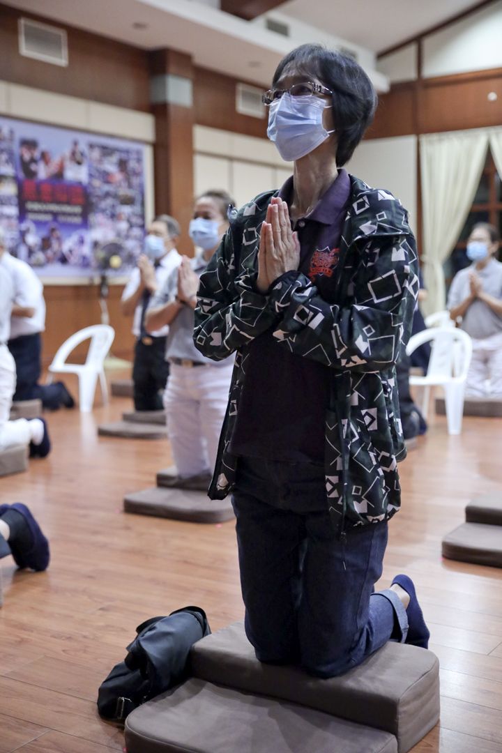 法会开始前,生活组组员根据政府规定的标准作业程序排放蒲团及小白椅,亦为参与活动的志工和大德们测量体温、记录姓名及手机号码,同时提醒大家佩戴口罩和保持社交距离。