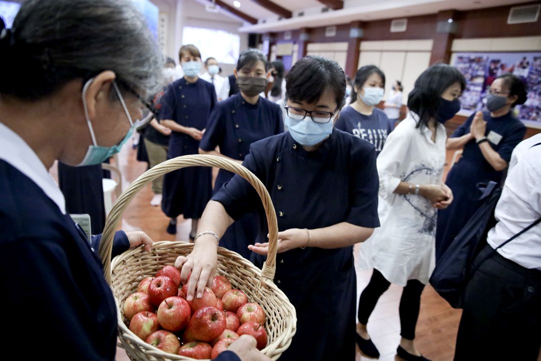 “吉祥月法会”活动结束时,会众在志工的引领下依序出班,他们从志工手上接过寓意平安的苹果,祝福大家欢喜度过吉祥月!