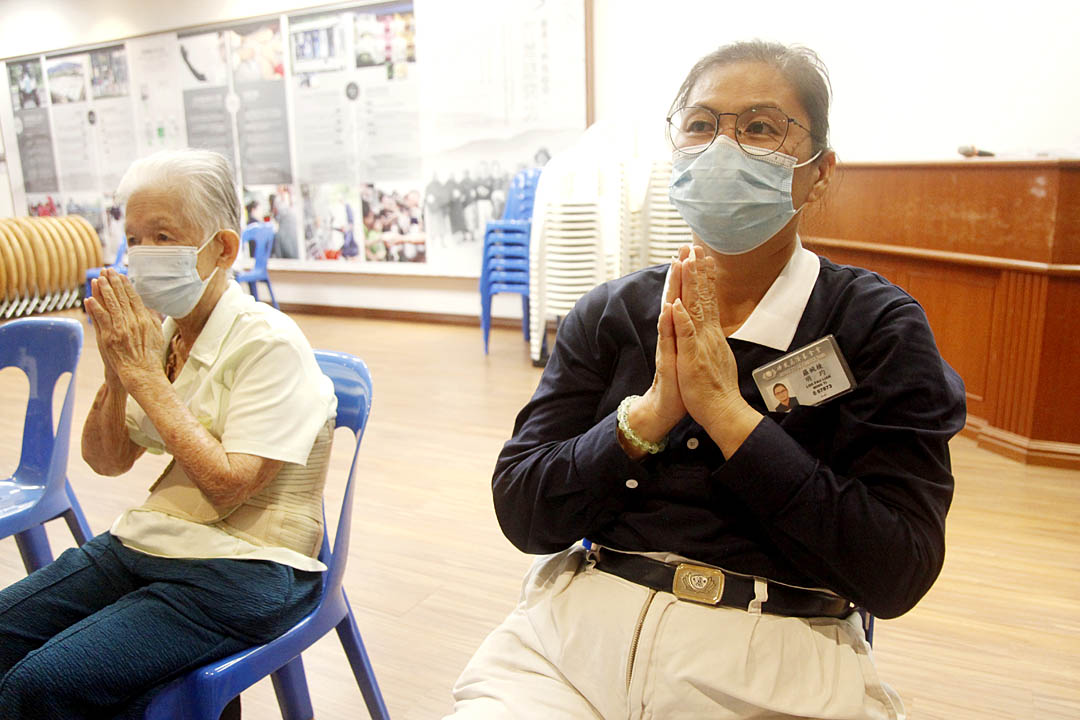 坐在唱经组里,许美兰大声唱诵与比划动作,腹部突起格外显眼,走路时而托住腹部,显得有点笨重。