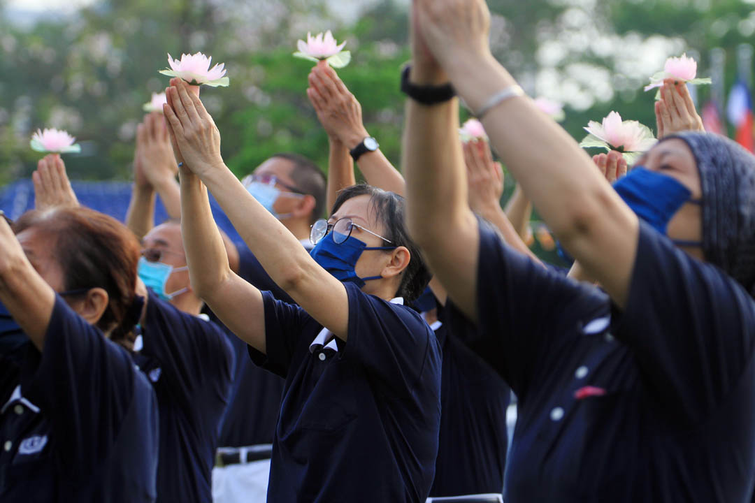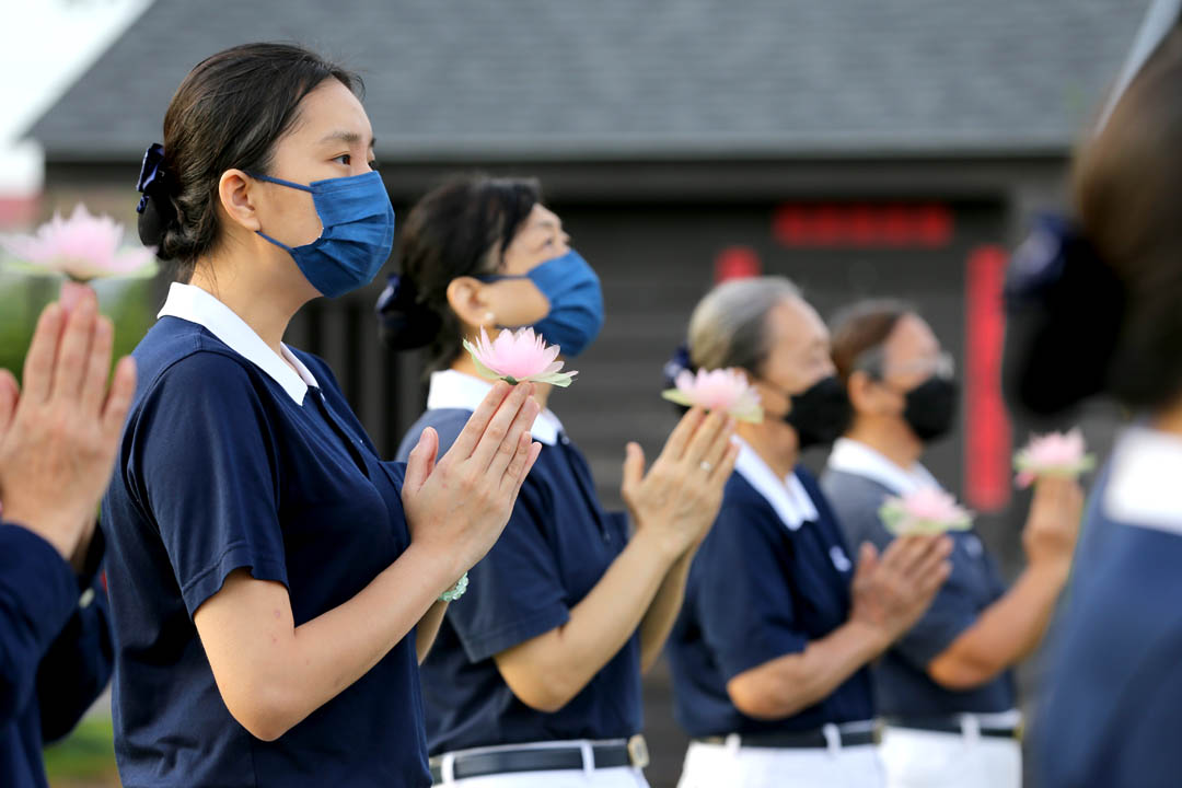 志工董秀慧(虑筑)心有戚戚焉,原本浮躁的心情,当穿上透明色的雨衣,犹如与琉璃佛一样,又因雨衣限制视线集中在前方,口中唱诵着〈祈祷〉 ,身口意专心在当下,心情逐渐沉淀。尤其唱诵〈灵鹫山上〉,她深有感触地说:“疫情让大家无法相聚,今年法师再度带领大家浴佛,真的因缘不散,如同在灵鹫山上一起闻法,很摄心。看见大家真好!”