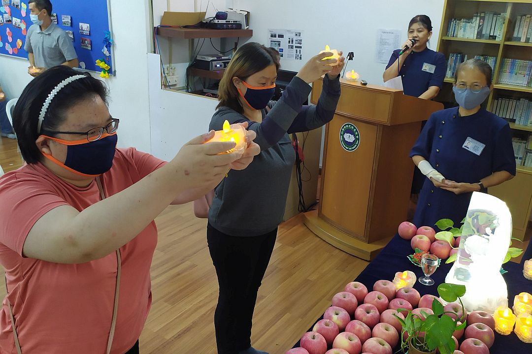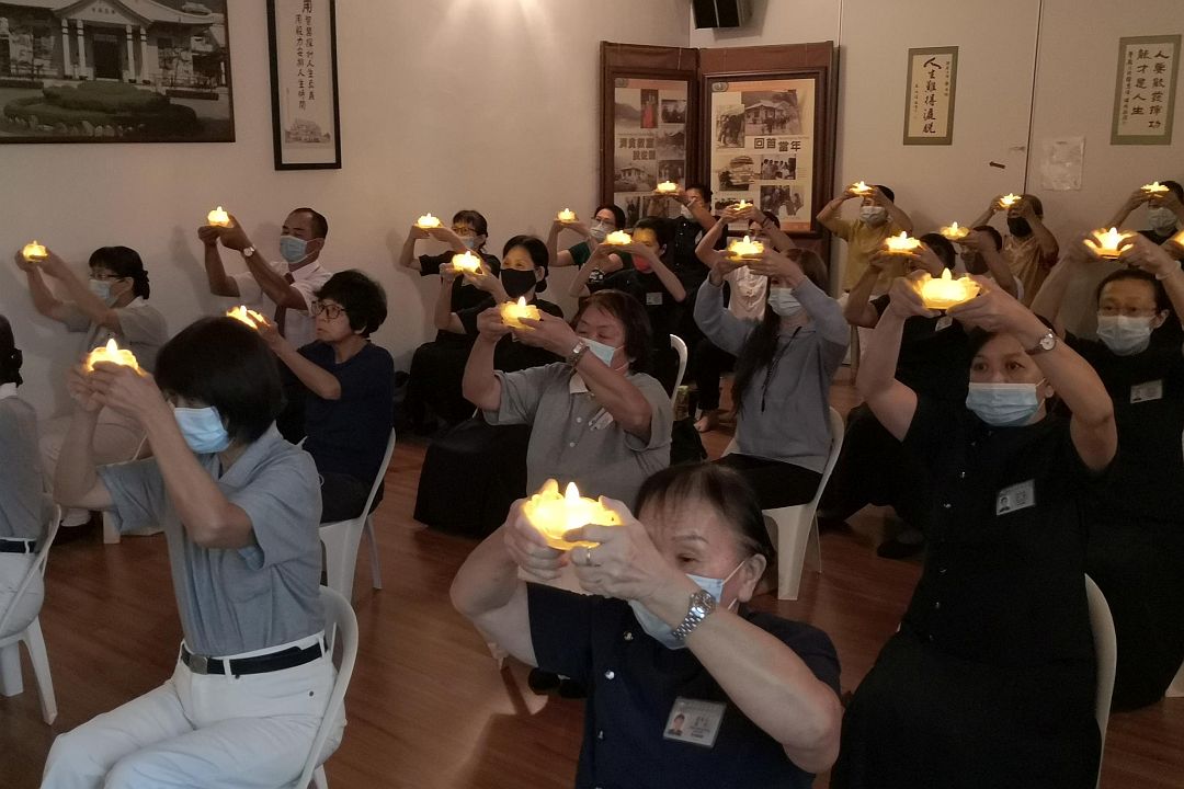 最后,众人在志工的引领下,齐心举灯唱诵《祈祷》,将功德回向逾九十万不幸亡者,也祈愿确诊者能早日康复。大家在依序供灯后,离开前都接领了一个寓意“平安”的苹果回家。今年的农历七月三梯次诵经法会圆满成就,希望来年,疫情不再,到时志工们就能邀约更多民众一起来参加法会了。