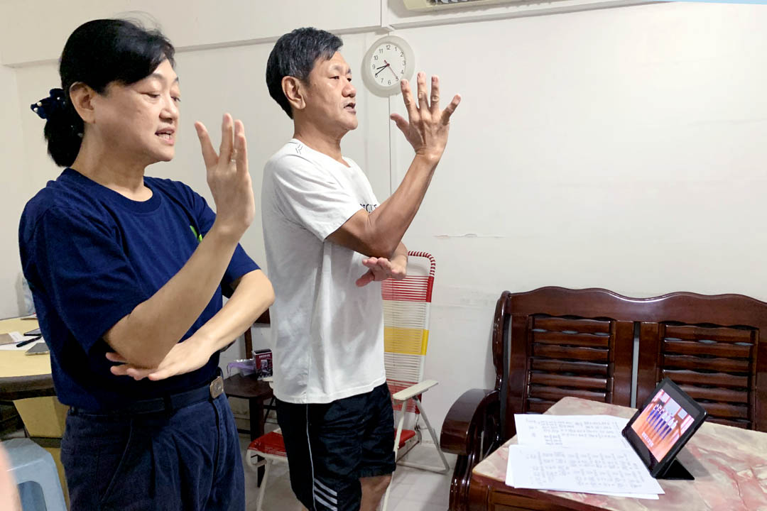 陈美谣看见杨泽沛的坚持,在背后默默地支持,适时提醒他多休息。在家只要有时间,两人会一起练习,陈美谣自认不擅长唱诵,便由杨泽沛主唱她配合,夫妻俩一起比划手语练习动作。