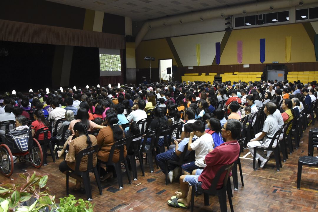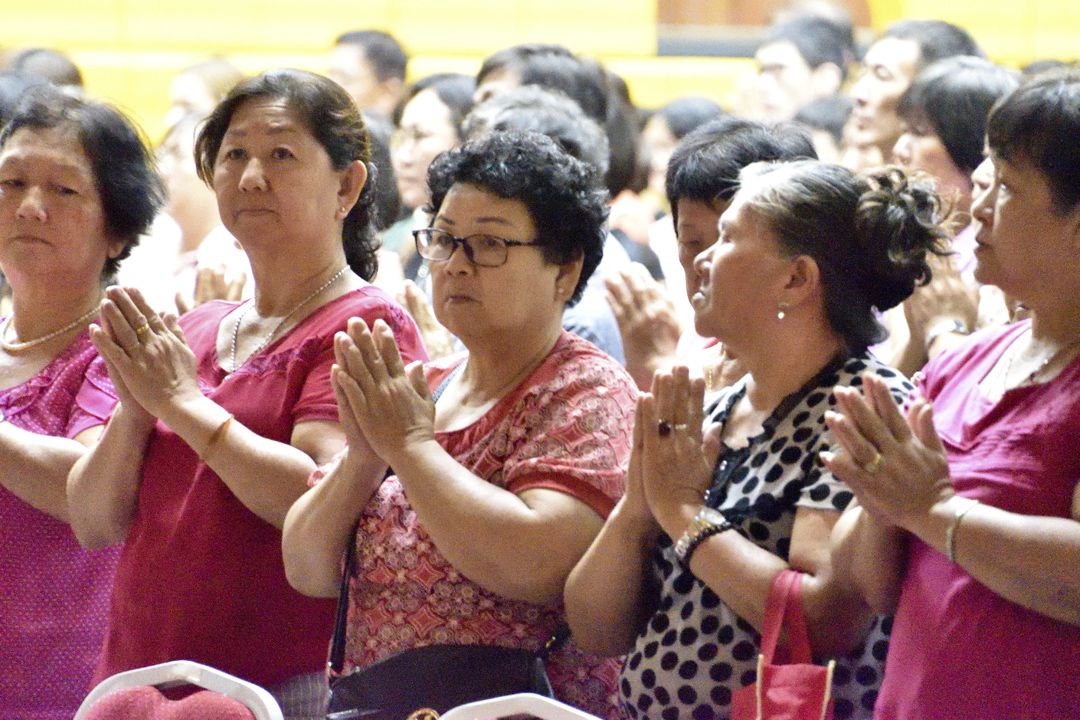夕阳西下,夜幕低垂,约六百位社区民众陆续抵达会场,因事前布达会场有共斋,大部分民众都自行携带环保餐具,享用由拿督温国成结缘的素食晚餐,以虔诚、恭敬心迎接一年一度的殊胜法会。