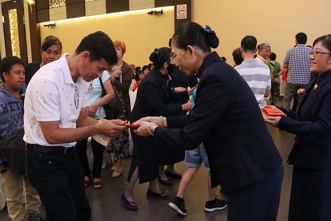 节目的尾声,慈诚及委员代表证严上人将福慧祝福的红包赠送给每位到来的会众。大家拿着红包都很欢喜,这是一份祝福,也是一份感恩会众多年来给予慈济的肯定与护持。期待串联大爱的精神,人人一起来当人间菩萨,打造一个祥和的社会。