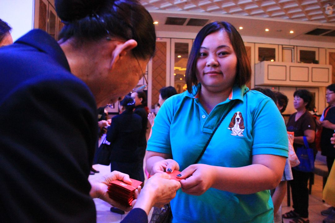 岁末祝福的尾声,众人虔诚唱诵〈诚心祈三愿〉,大家一起祈祷,祈愿天下平安无灾难。慈诚委员将福慧红包结缘给每位会众,希望人人接受到证严上人的祝福。