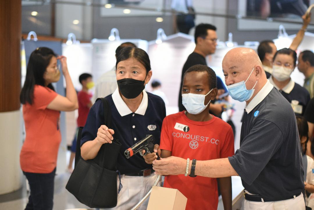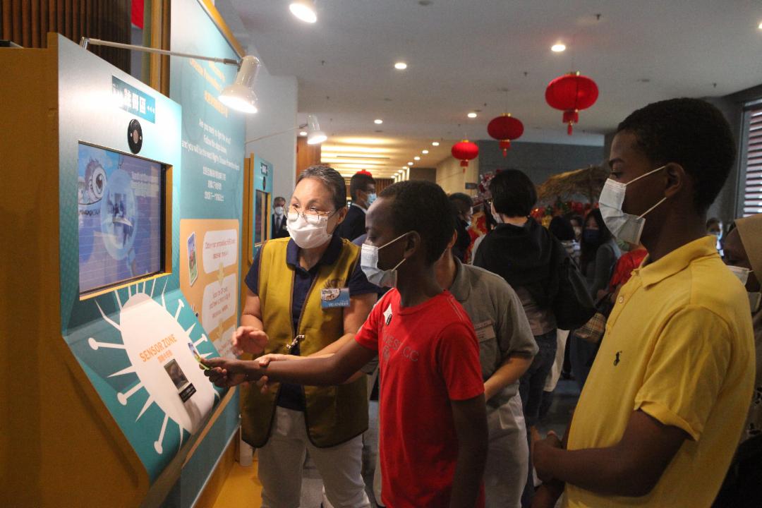 随即,大家列队于阶梯上,背着宏伟的静思堂,高喊三声“索马里”,留下难得的大合照。之后,志工带领大家进入人文厅,举心灯祈福、投竹筒、慢步浏览法华坡道;孩童却在防疫战斗营科学展玩得不亦乐乎。