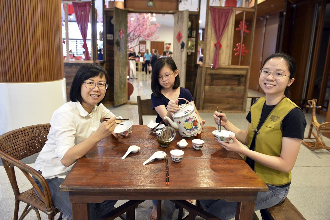 瑞颖说:“每样物品都给我很大的惊喜,今天犹如上了一堂宝贵的生活教育课。”煤油灯旁的一个小铁壶,壶嘴又长又细,原来是用来添火水进煤油灯,令她大开眼界。火炭炉旁插着一把蒲葵扇,原来除了木材、火炭,起火也少不了那把扇,最后还得靠功夫和时间,烧一顿饭真的很不简单。