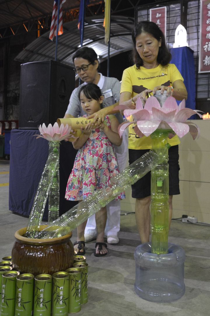 竹筒岁月歌曲响起,掀开岁末祝福序幕,许多会众拎着竹筒扑满列队出来响应竹筒回娘家,将满满的爱心倒进宝特瓶制成的莲花竹筒中,宛如汇聚众人的点滴爱心流入功德海,让爱传出去。