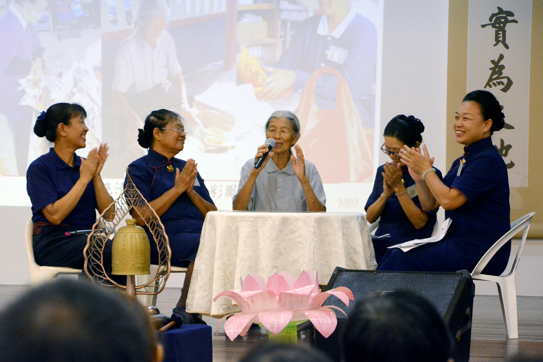 活到老、学到老,多名志工在台上分享做环保心灵成长的喜乐。 “若我一天没有去做环保,就会感到浑身不自在。”七十六岁的环保志工莫慧娟开始跟志工去环保站付出时,眼看被丢弃的瓶瓶罐罐、衣服和纸张,经过分类后能够再循环利用,心里感到欢喜。五年来,她经常骑机车到环保站做资源分类,为地球尽一点力。自从做环保后,莫慧娟更懂得节约爱物,脾气也收敛,不再乱骂人了。