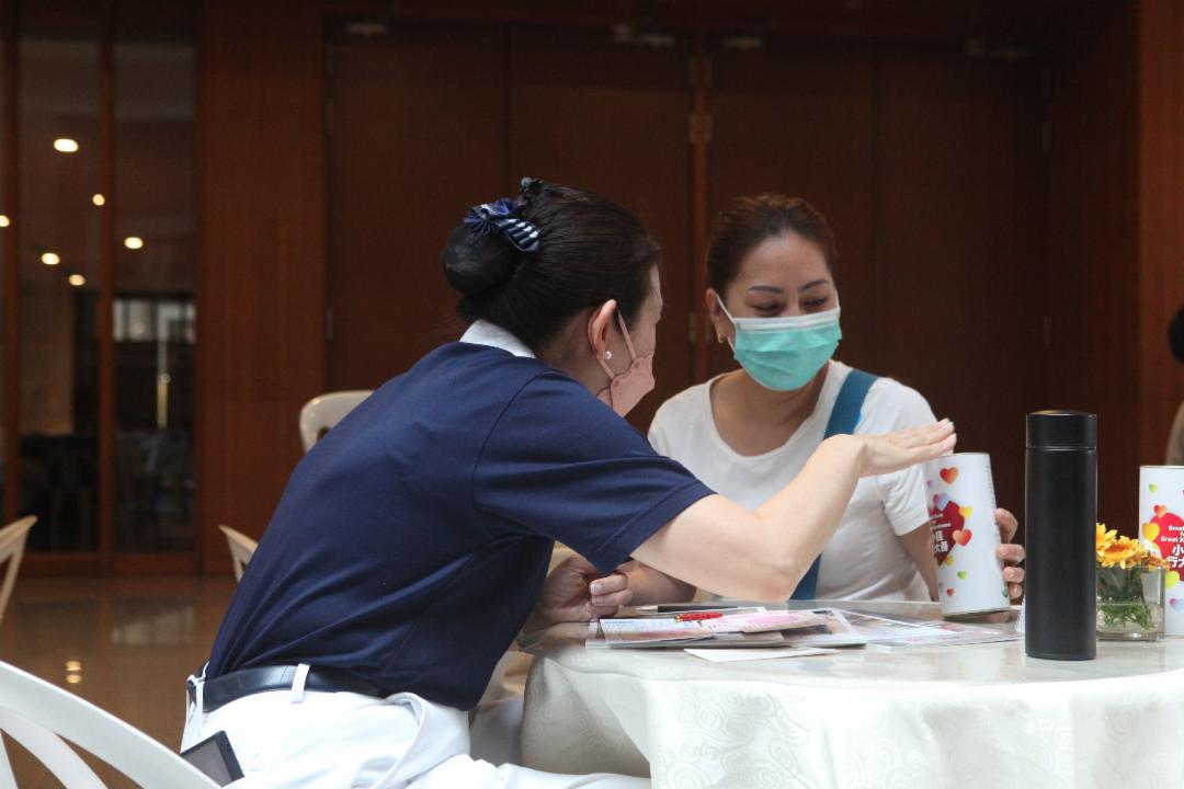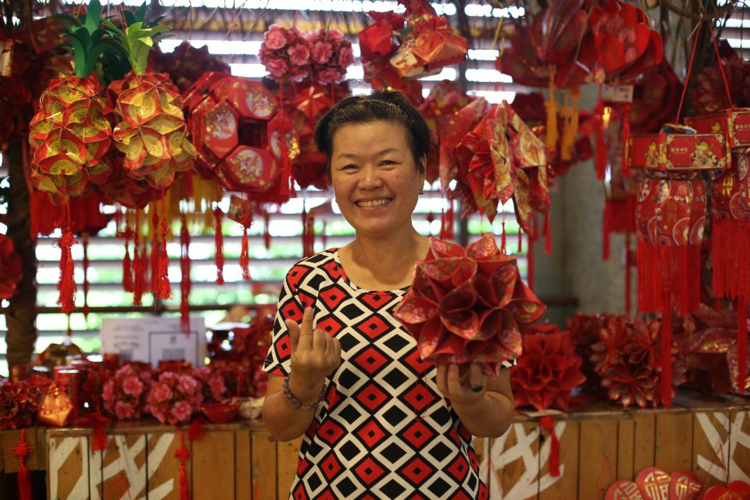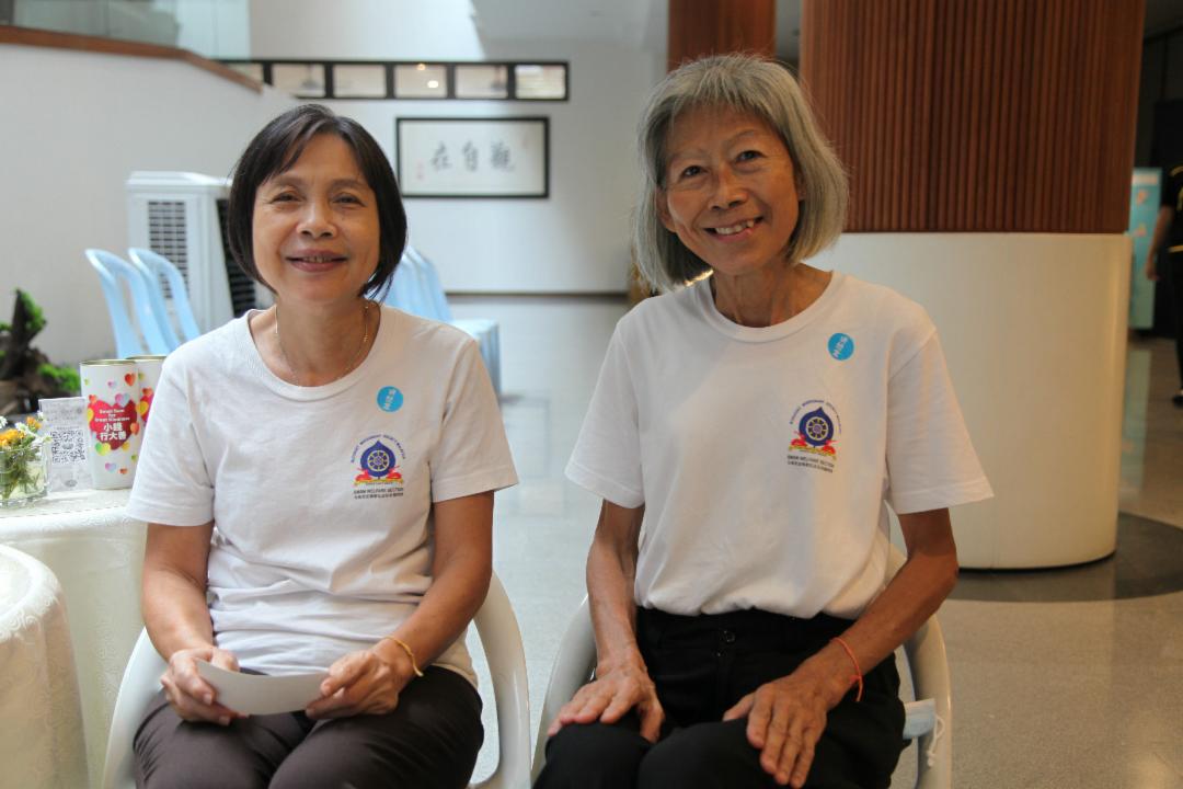 紧邻斋堂的义卖区,热闹得很。志工废物利用,巧手用回收红包封制作的扇子、灯笼满堂红;小巧的手工首饰金闪闪,张雪萍一口气买了多款首饰,准备分送给跳舞的朋友和小朋友。她说:“做善事时也能送礼予人, 选得开心,买得开心, 送得开心! ”她赞叹志工很伟大, 成就义卖做好事。