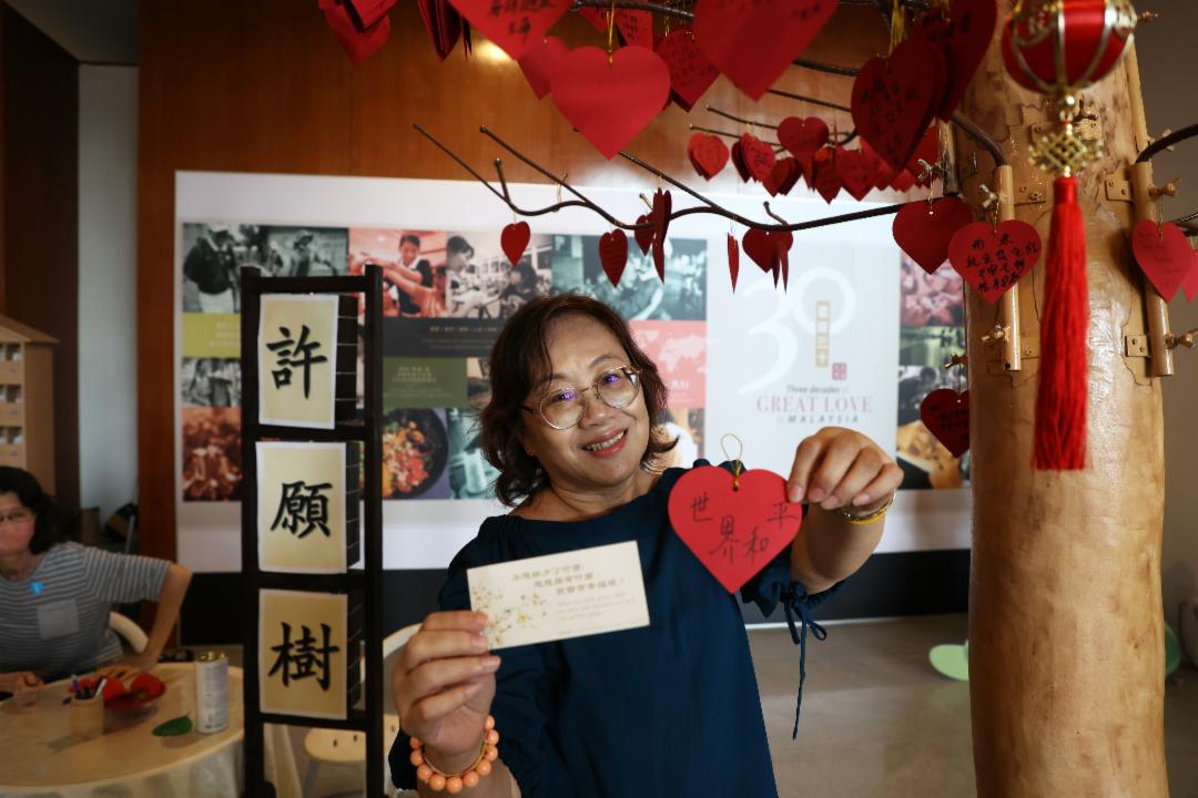 林桂娥很珍惜每一年收到的福慧红包,并把它们依着年份好好存放在相簿里。看到许愿树,林桂娥喜悦地马上拿了许愿卡,虔诚写上世界和平的祝福语。她说,期望这世界不要再有战争,大家可以团结一致。