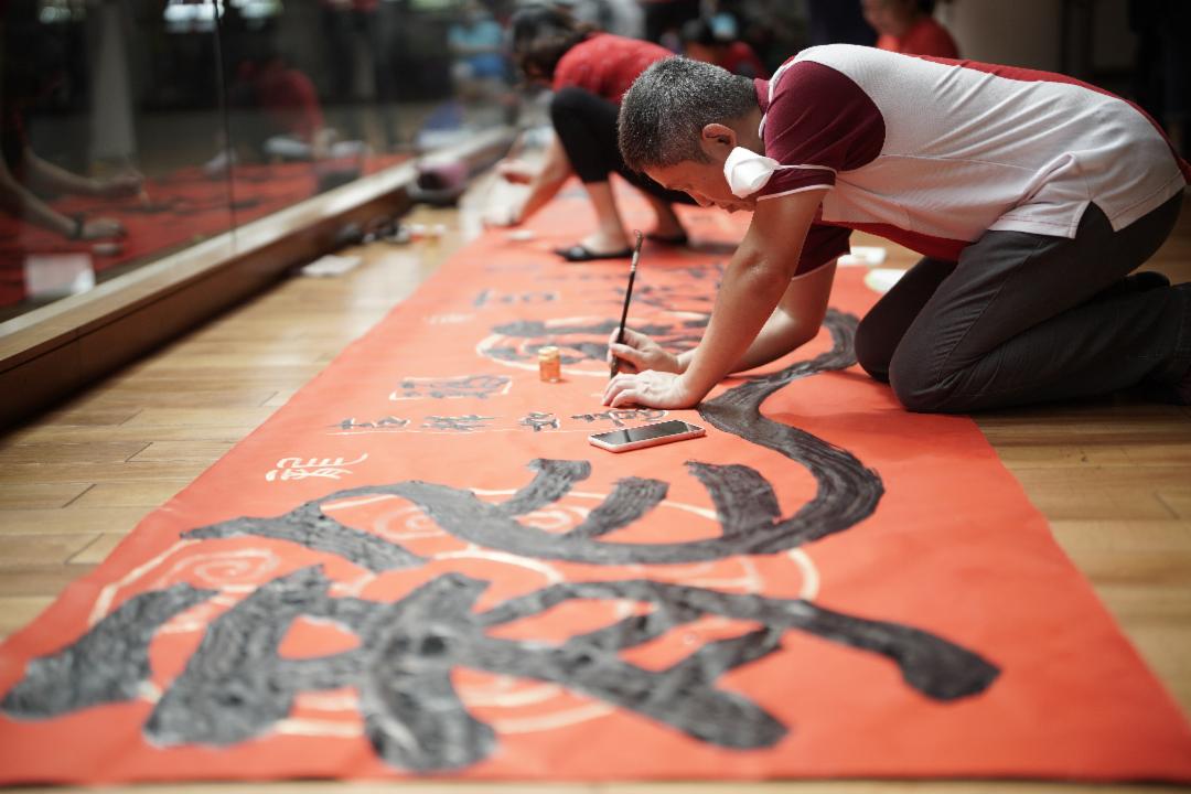 感恩堂外的长廊,红红的春联带来新气息;长达二十尺的榜书横卧地上,以四种书体挥毫大字、长龙腾跃其上,气势磅礴,这是春联展区的一大特色,吸引会众选购,把“春意”带回家,取个好意头。