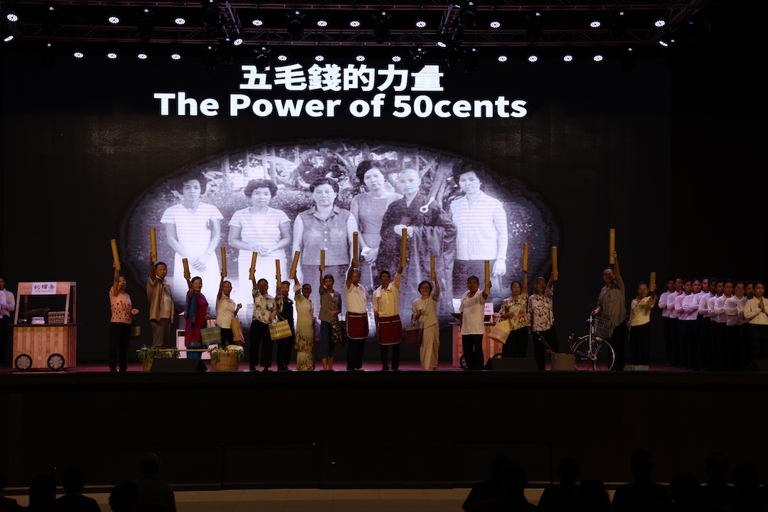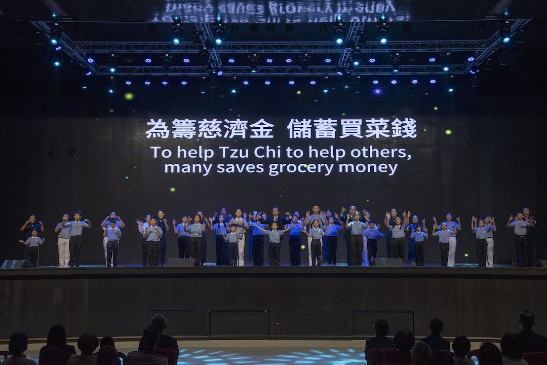志工装扮成市场里走动的市井小民,用短剧的模式重现当年在市场推动竹筒岁月的点滴;接着登场的亲子班的学生与家长,他们用手语演绎〈竹筒岁月〉,让现场的会众重温慈济的重要起点,更进一步留下“小钱也能行大善”的印象。