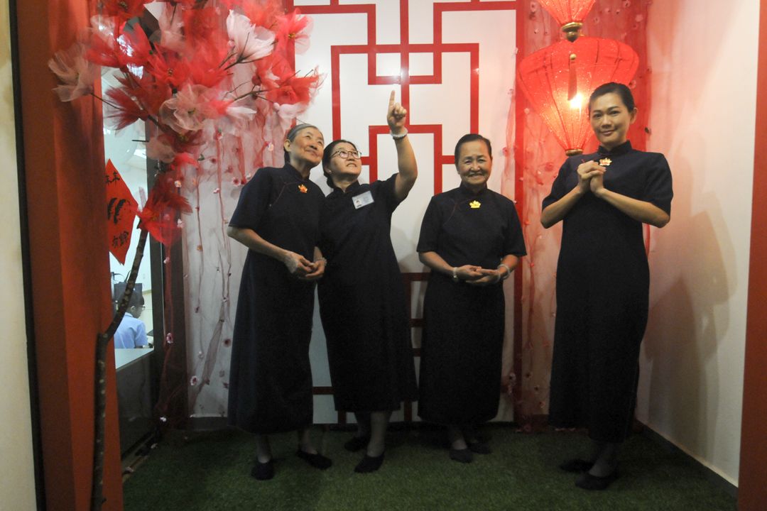 会场的另一隅则融入了居家摆设的客厅,除了高挂的灯笼与梅花、牡丹花相互辉映之余,亦有以红纱布为背景,贴上志工们以巧手折成的“老鼠”小挂饰,为会场增添新春气息。成功“变身”后的联络处,它不仅仅是联络处,更是社区会众和志工们的心灵驿站,让出席的志工心里倍感温馨与怀念。