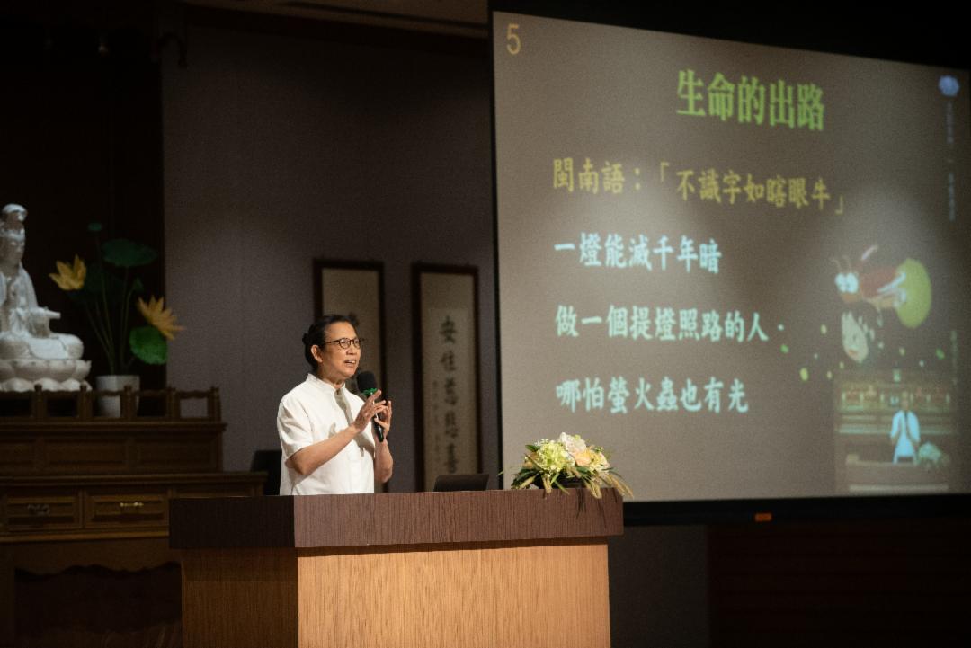 她带笑举例:“女人在吵架的时候,为了显示自己辈分很高,会讲一句'你祖妈(闽南语)'。然而,经由证严上人的教诲之后,这些人从家里的祖妈变成社会的妈祖,用爱心去关爱人间。”洪静原亦表示,当我们找到一线光亮,若将这一点光带进来,此光能灭千年暗。她期勉人人在黑暗中当一个提灯照路人,哪怕只是小小的萤火虫之光,亦能发光发亮。