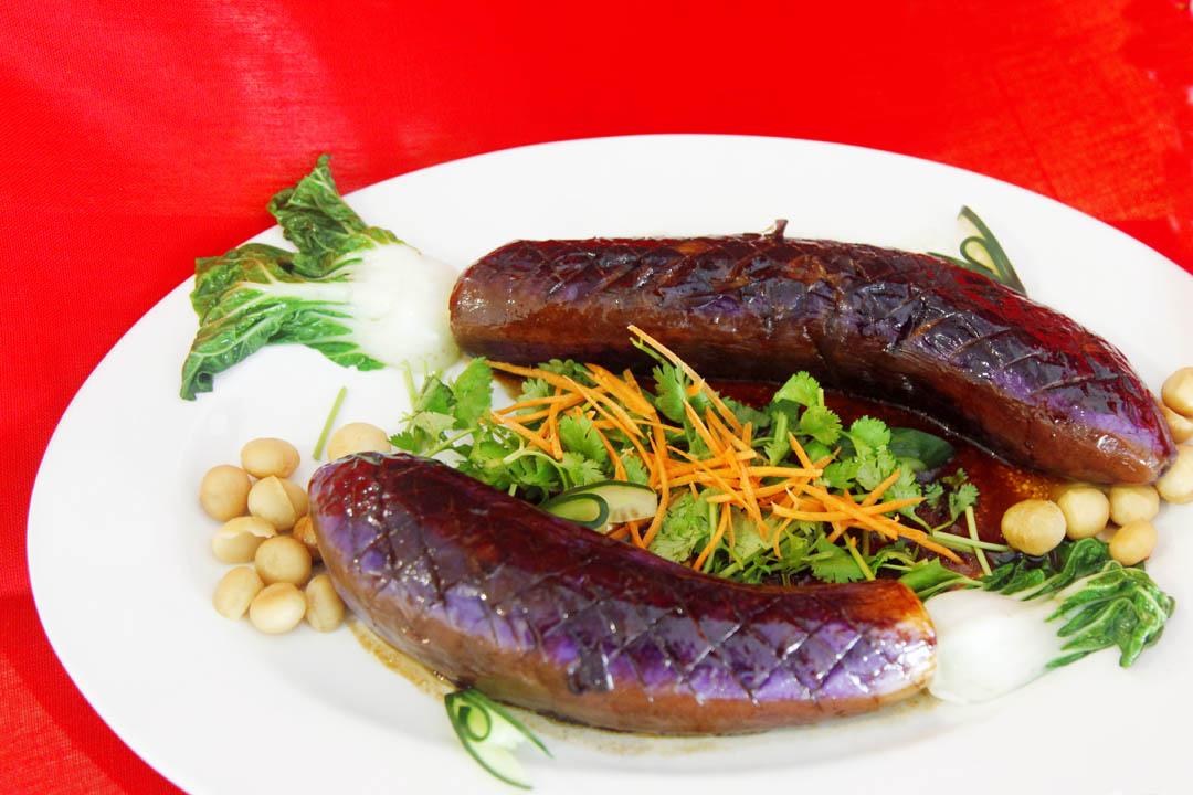 于是在“年年有余”菜肴,他选用两条中型茄子,弯曲像鱼身,轻轻打斜切格子状,好像鱼鳞形状,用少油煎熟再快速汆烫去油后摆盘,切小黄瓜做鱼鳍,奶白菜切分为二做鱼尾,铺夏威夷果好像水中泡泡,两条嬉戏的鱼中间,则以萝卜丝和香菜丝作珊瑚。最后淋上以妈蜜酱、生抽、香油、冰糖等煮成的酱汁,为菜肴上色。